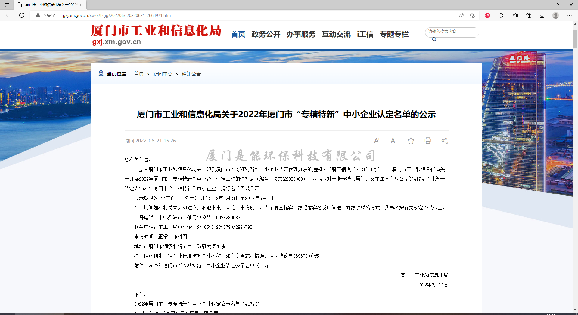 2022年621日廈門市工業(yè)和信息化局,公示了2022年度廈門市“專精特新”中小企業(yè)認(rèn)定名單,廈門是能環(huán)??萍加邢薰竟鈽s上榜。繼此前獲得國家高新技術(shù)企業(yè)認(rèn)定之后,我司憑借著專業(yè)化、精細化、特色化、新穎化的專項實力,首次成功入圍廈門市“專精特新”中小企業(yè)隊伍